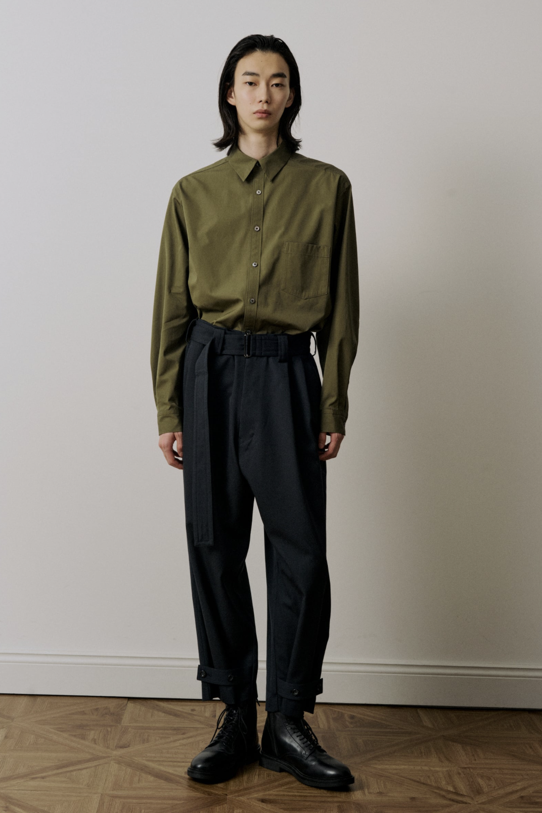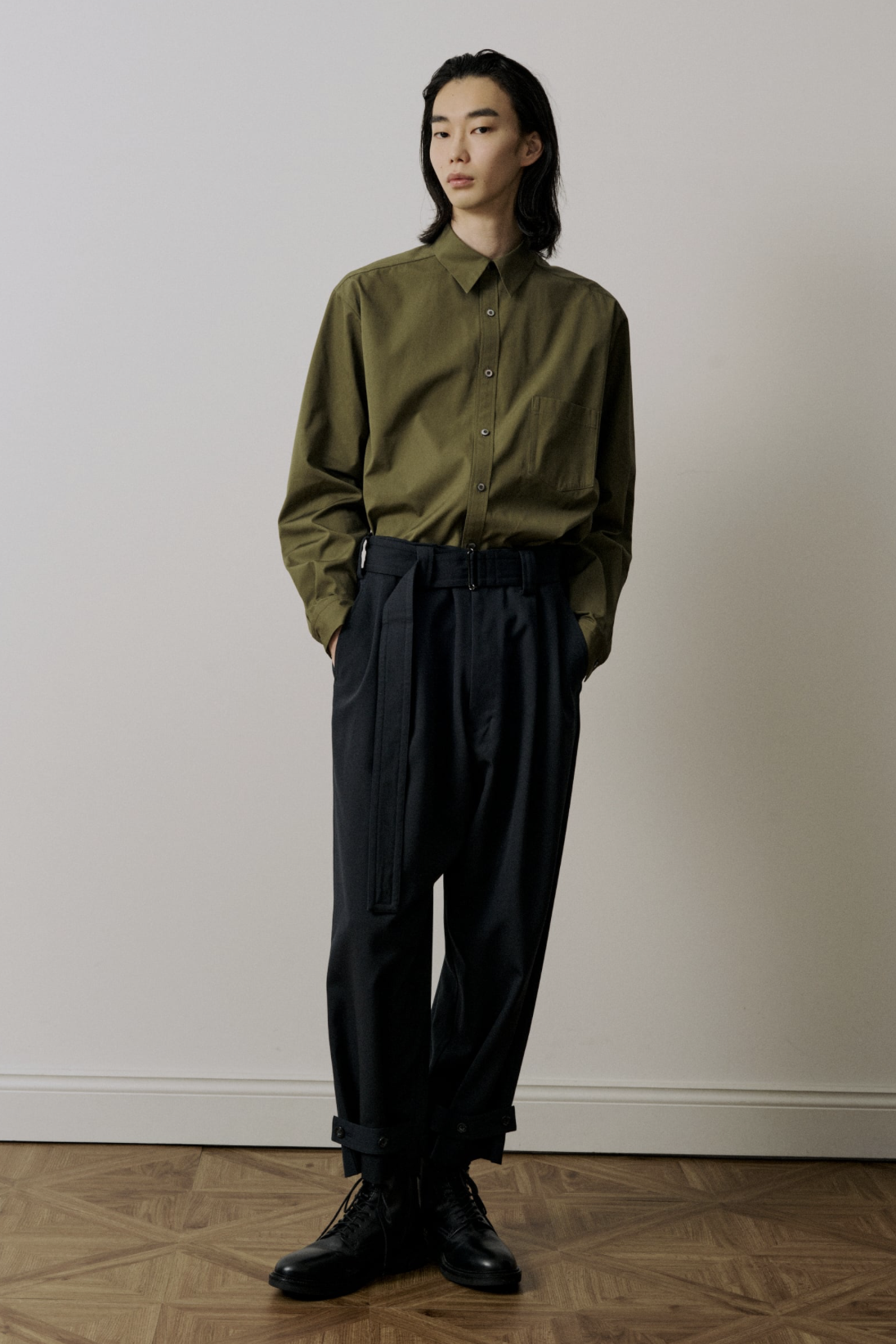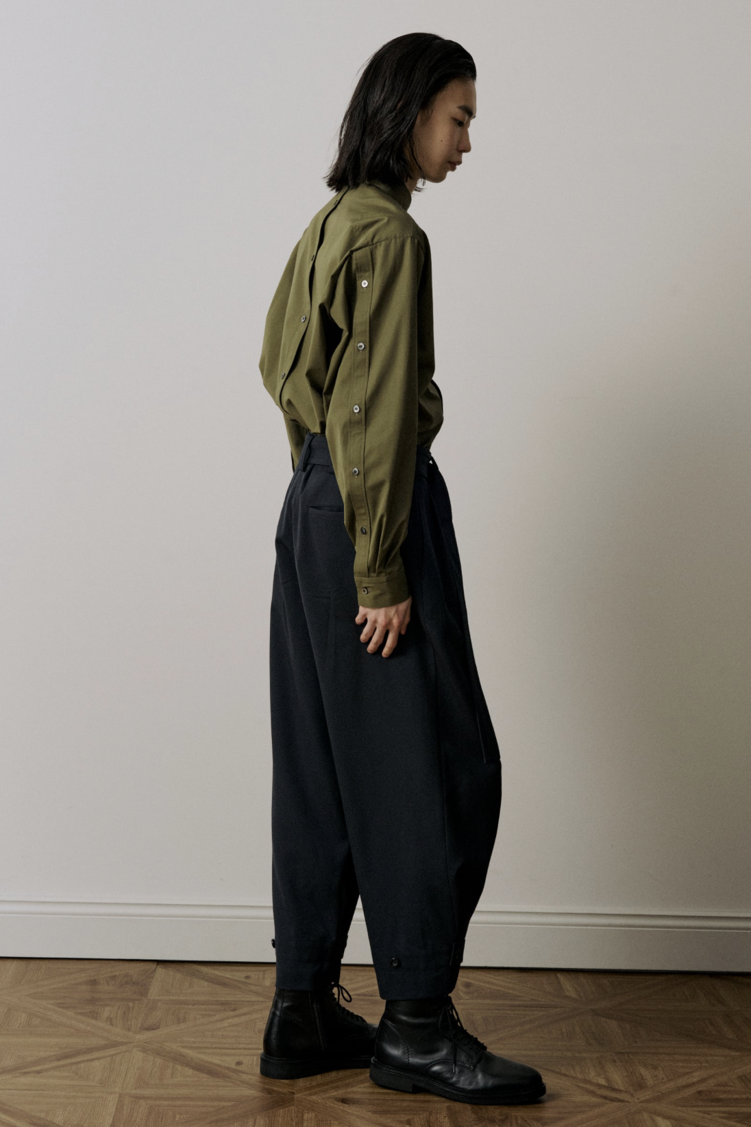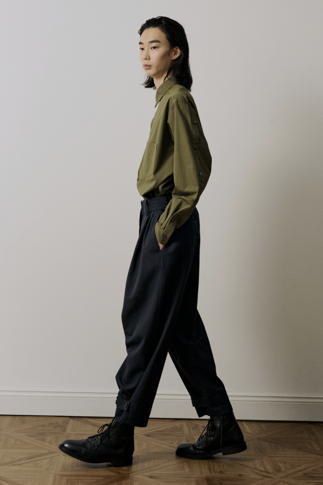 2タックでたっぷり分量をとったワイドシルエットのパンツです。裾のベルトタブを着脱することで、裾を絞ったシルエットと、ワイドシルエットの両方を楽しめるアイテムです。やや短めの丈感で重くなりすぎない印象に仕上がっています。