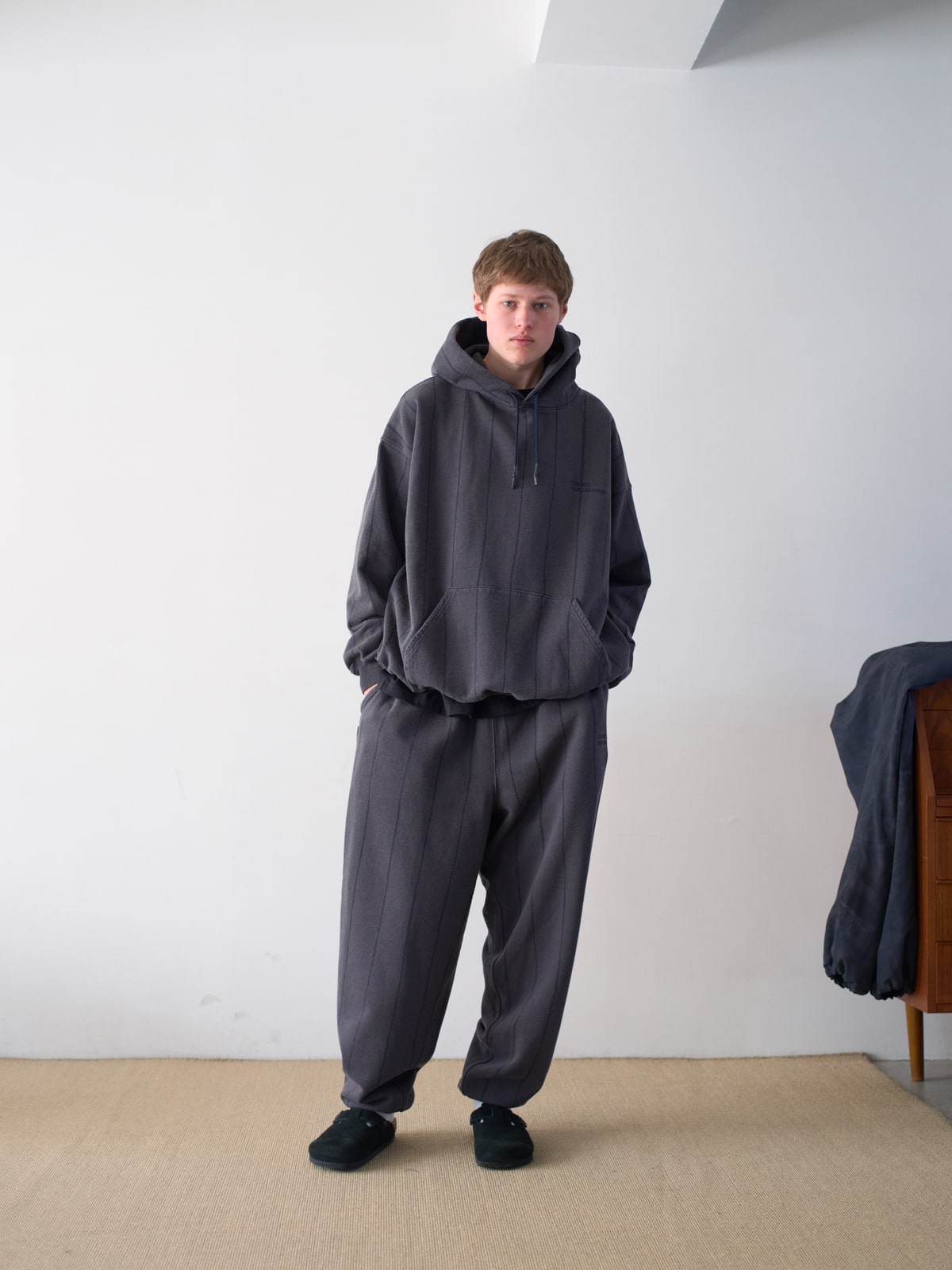 S.F.C (エスエフシー)のSTRIPE WIDE SWEAT PANTS (DISCHARGED) / NAVYになります。新型のスウェットパンツ。膝から下を太めに設定したボリューム感のあるシルエットが特徴です。SFCオリジナルストライプ柄だけを残して背景の生地の色だけを落とした抜染加工を施し、古着のような風合いを出しています。素材は空気を含ませた太番手の空紡糸を使用したシャリ感のある度詰め裏毛で、着心地がさらっとしており、しっかりとした肉厚なので洗いをかける度に風合いが増していきます。