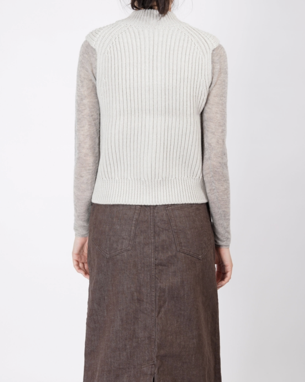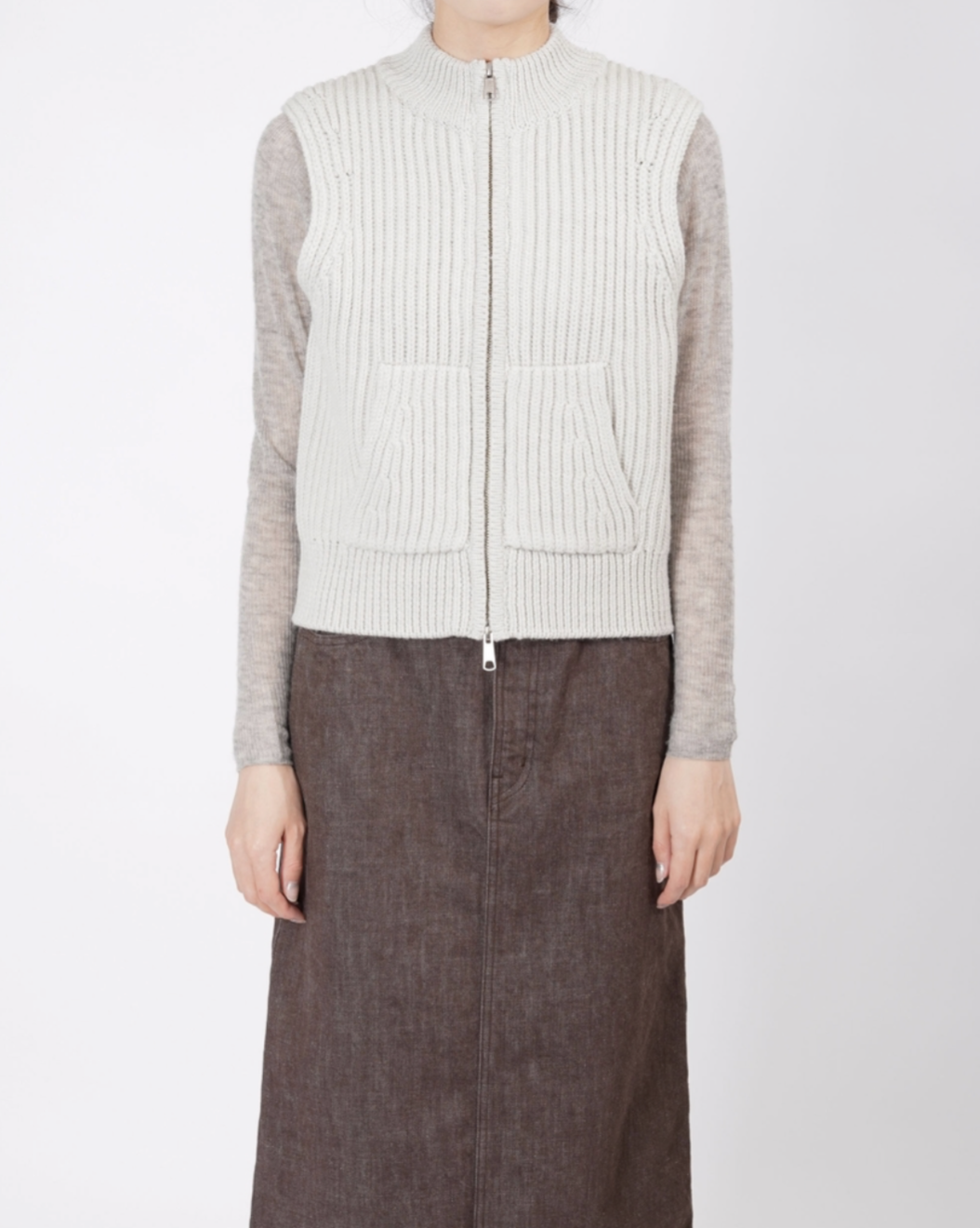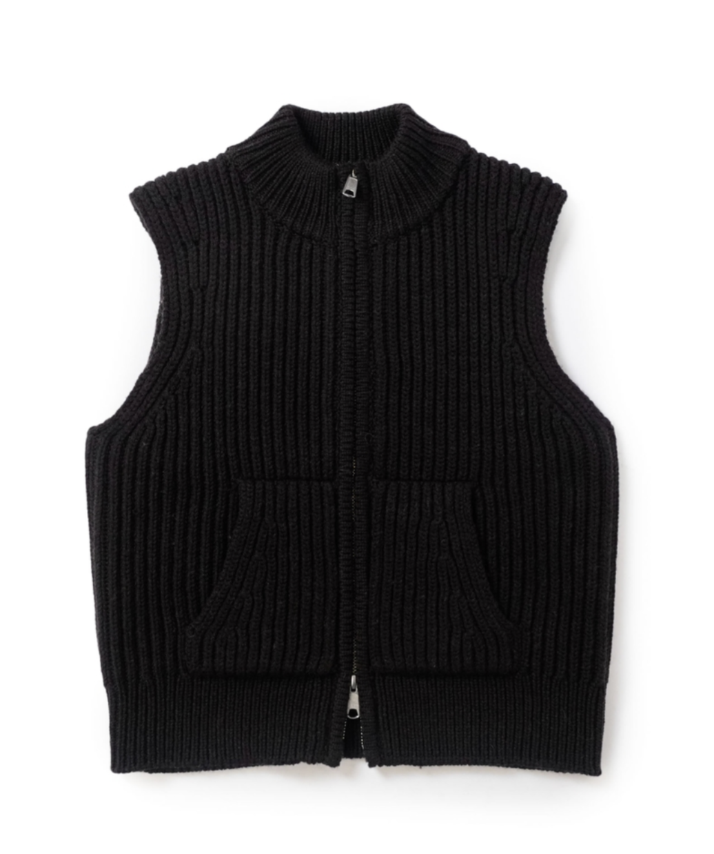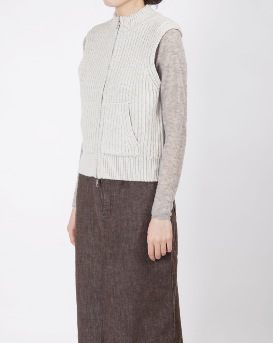 メリノウール100%のドライバーズニットベストです。つるっとした毛羽立ちの少ないウールの糸でざっくりとローゲージに編み上げました。 コンパクトめなフィット感。カンガルーポケット付き、WZIP仕様。絶妙なニュアンスカラーの2色展開。 サンプルサイズF/モデル162cm 素材 WOOL90% POLYESTER10%