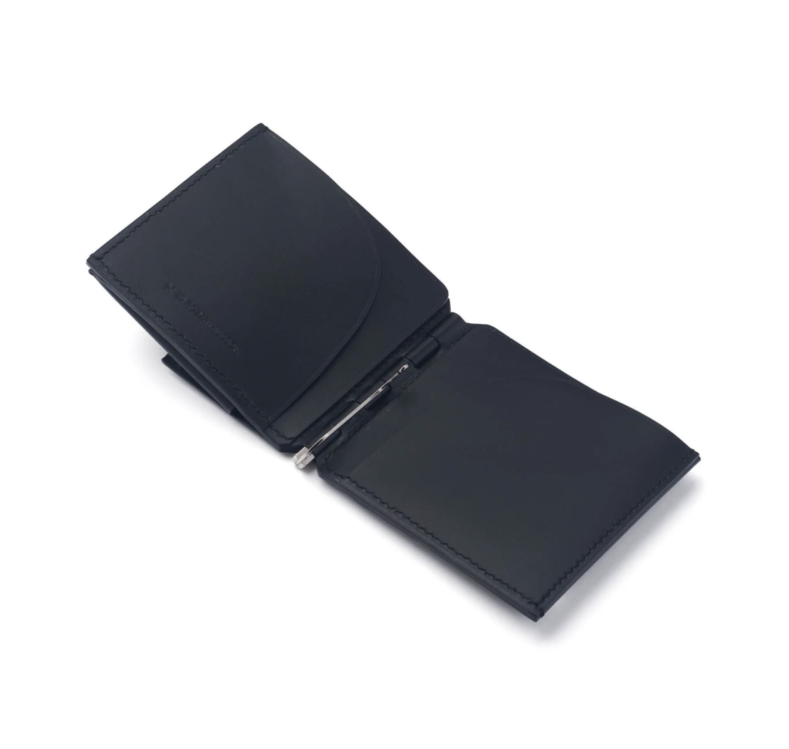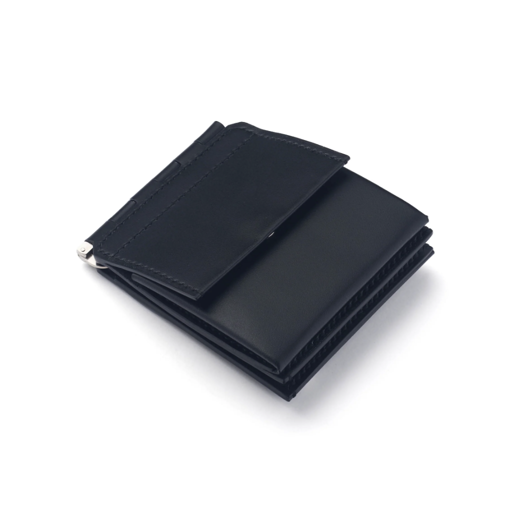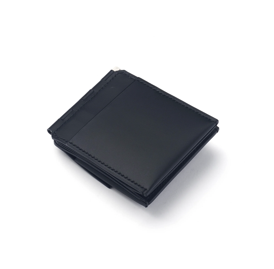 財布の可動部分にドアなどに使われる蝶番の仕組みを取り入れた、マネークリップ式ミニウォレットです。 お札はマネークリップに挟み、内側に収納できます。 -クリップ式札挟み -カードスロット×4 -仕切り収納×4 -マルチポケット×1 -フラップ付き収納×1 MATERIAL ORIGINAL MICRO GRAIN LEATHER SIZE H:10cm W:8.5cm D:1.5cm