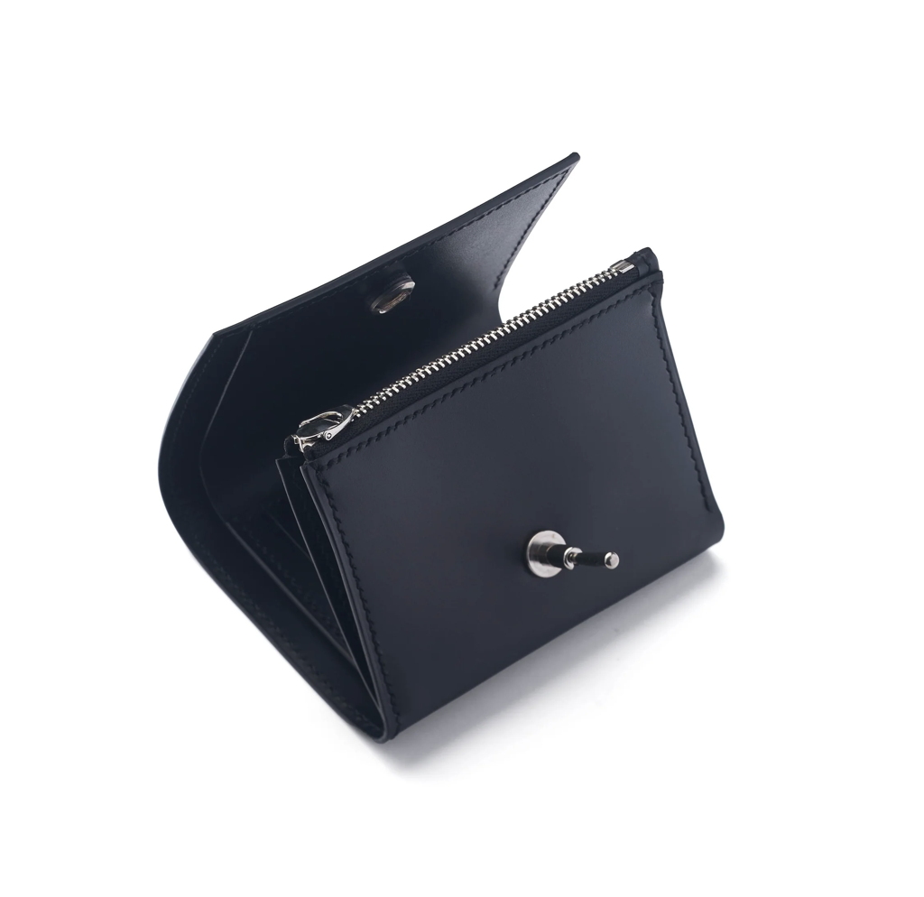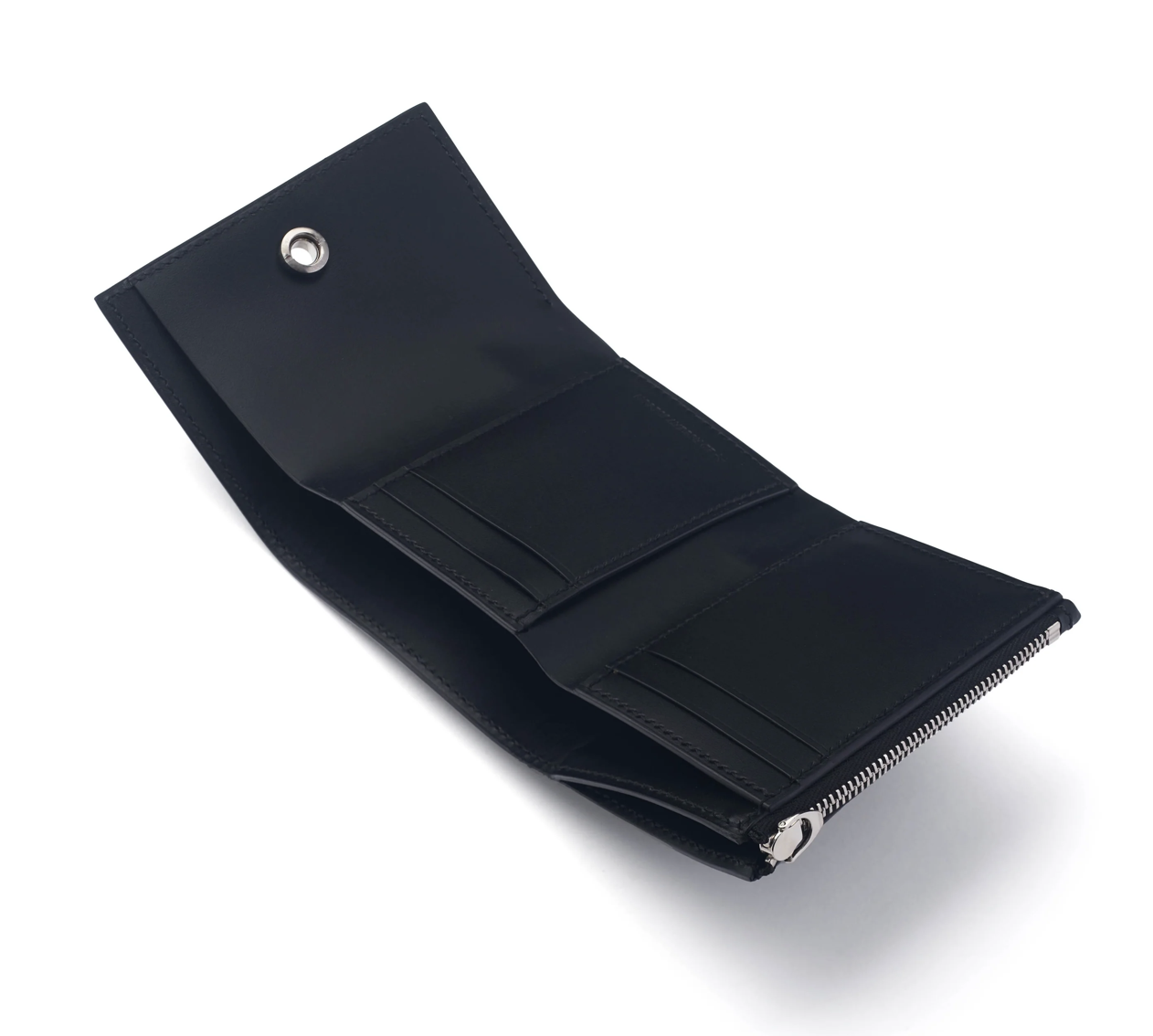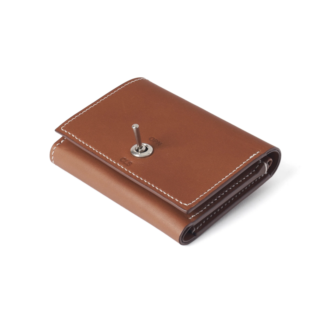 電気装置の様なスイッチレバー型の留め具で開閉する3つ折り式の財布。
