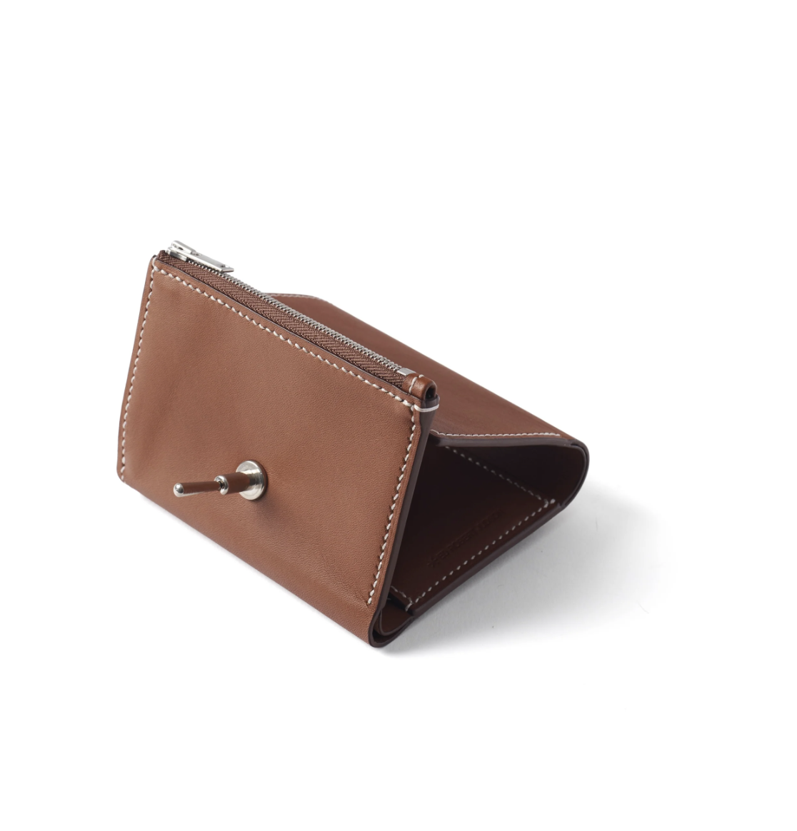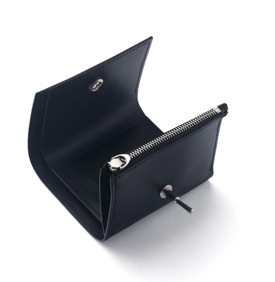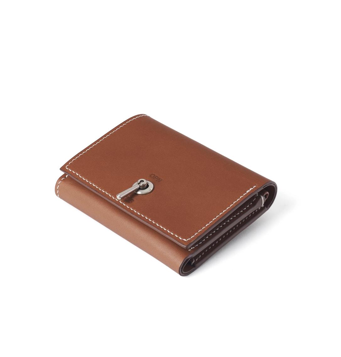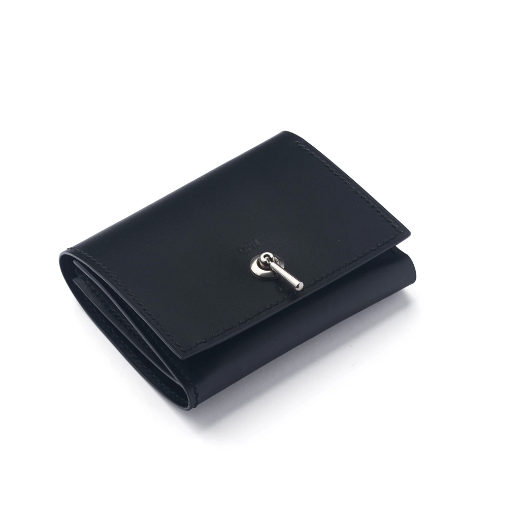 電気装置の様なスイッチレバー型の留め具で開閉する3つ折り式の財布。