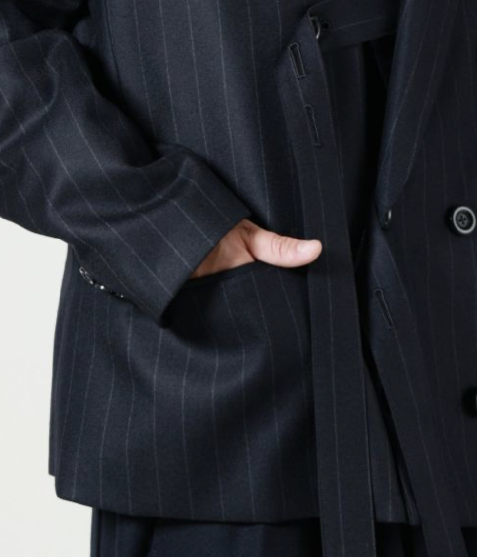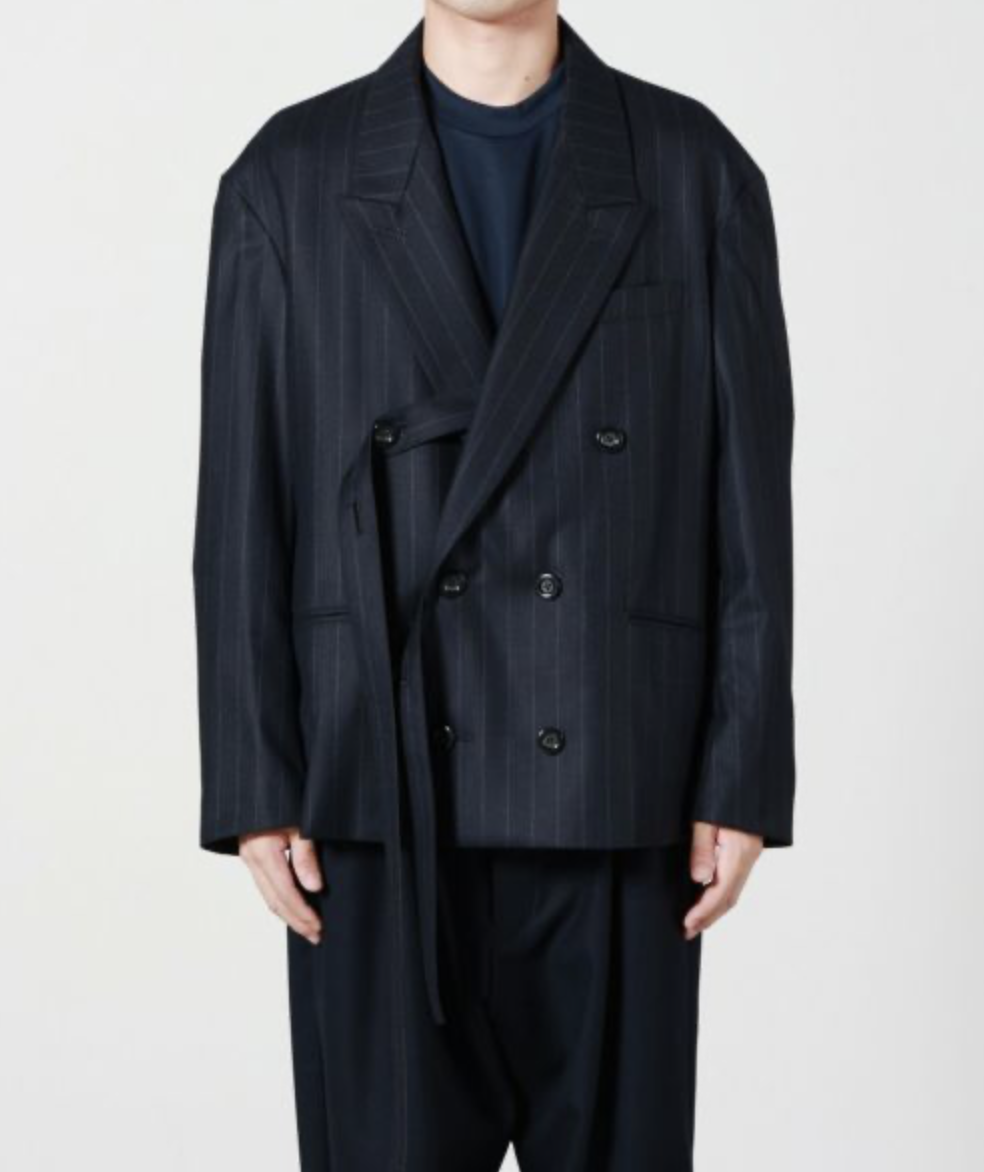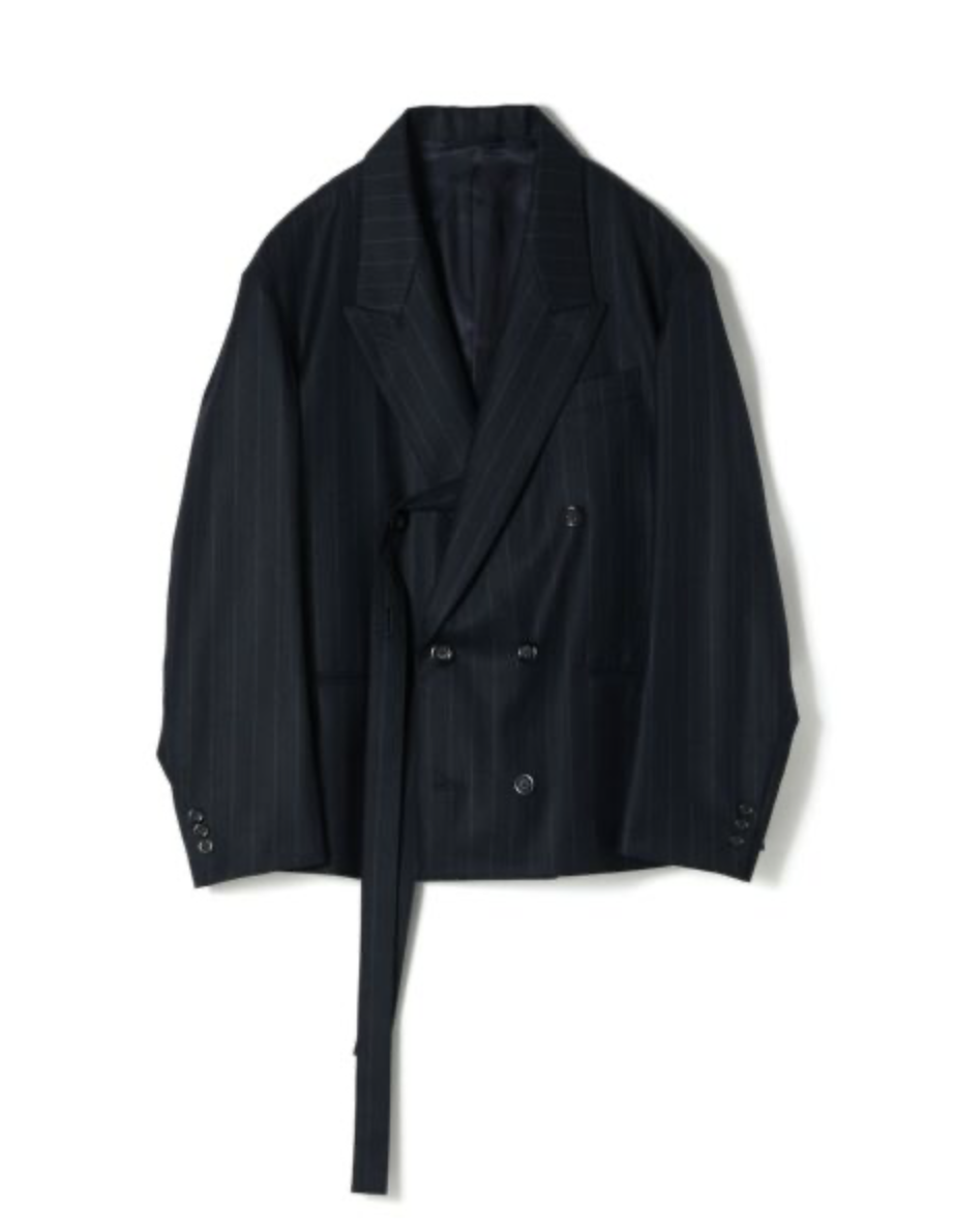 UJOH(ウジョー)のスペンサージャケット。ドロップショルダーで抜け感漂うボクシーなシルエットを採用し、オーセンティックなダブルジャケットをラフな印象に仕立てました。内側に付いたベルトでお好みの位置に留められるデザイン性の高さも魅力です。