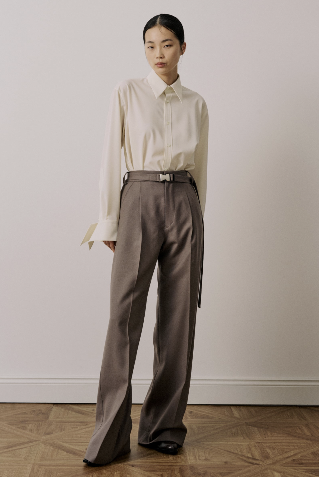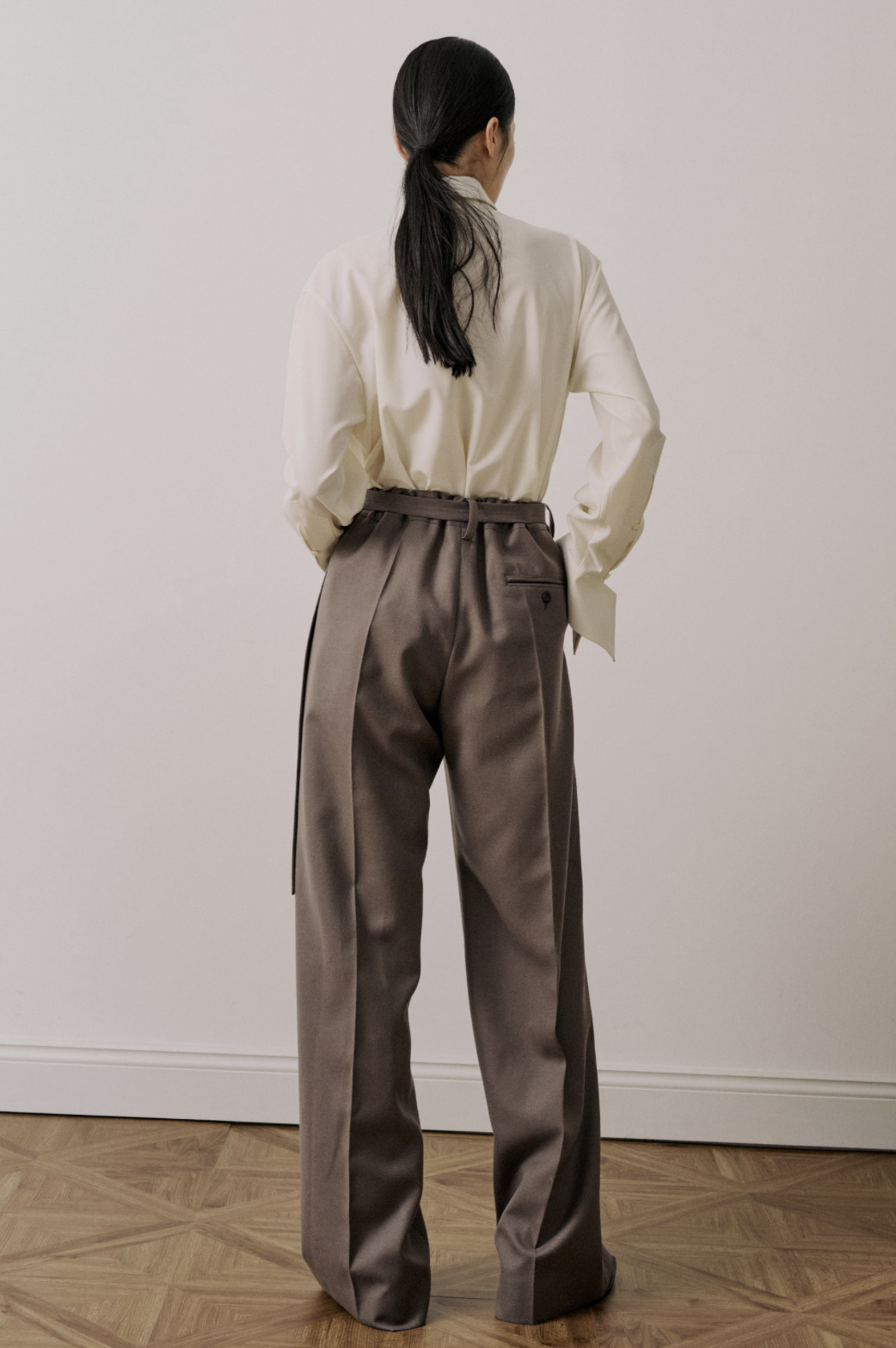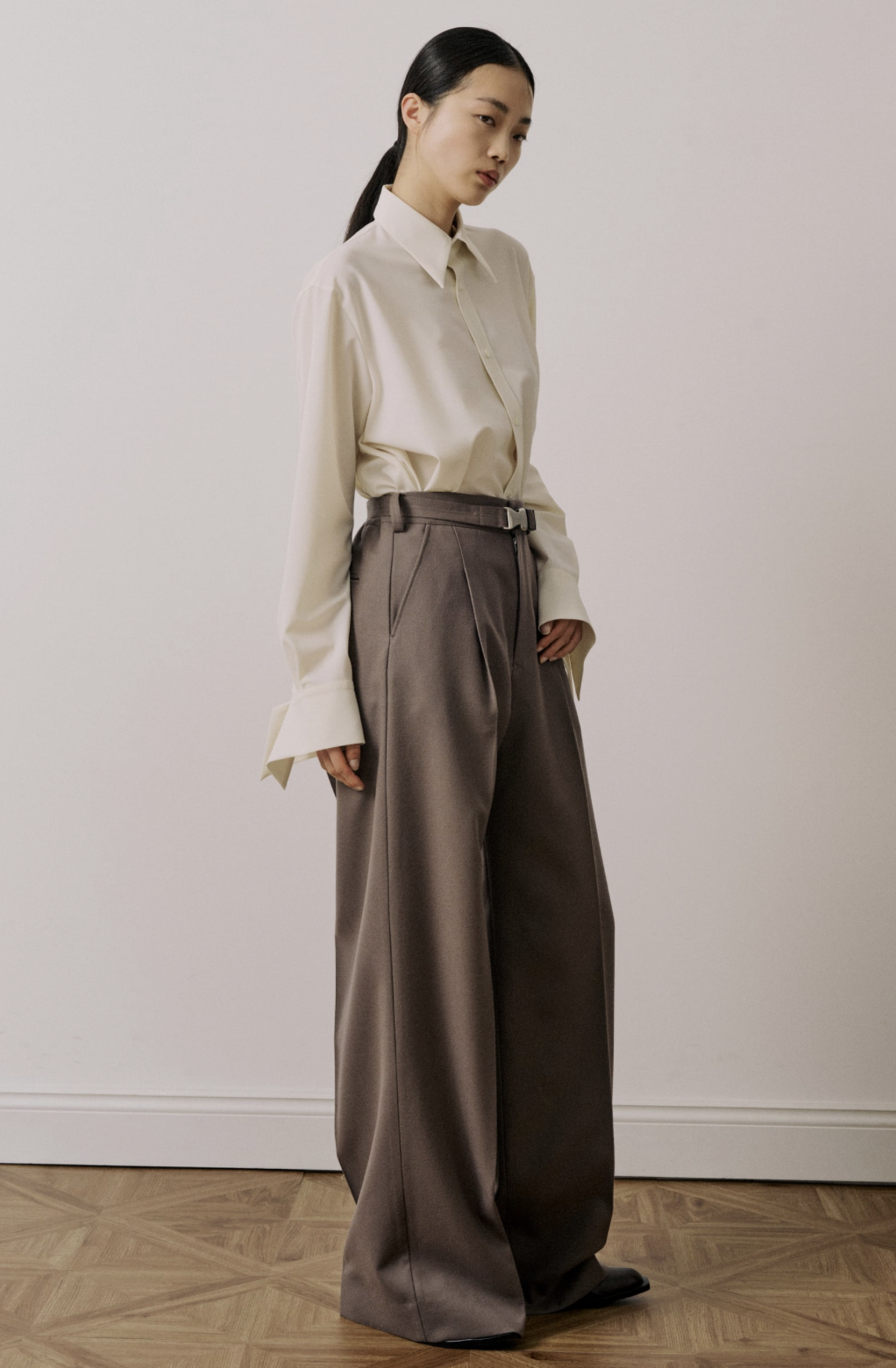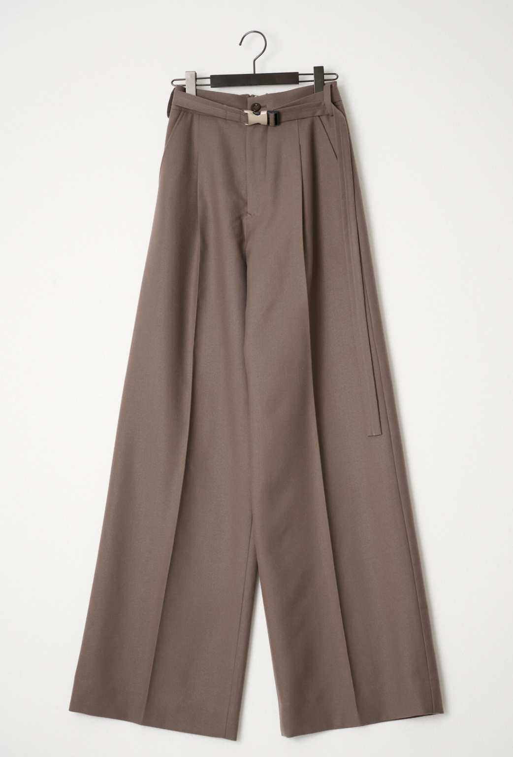 ワイドなシルエットにこだわり仕上げたパンツです。後ろのウエストはゴム仕様でストレスフリーな履き心地です。スポーティなバックル付きのベルトがアクセントになっています。