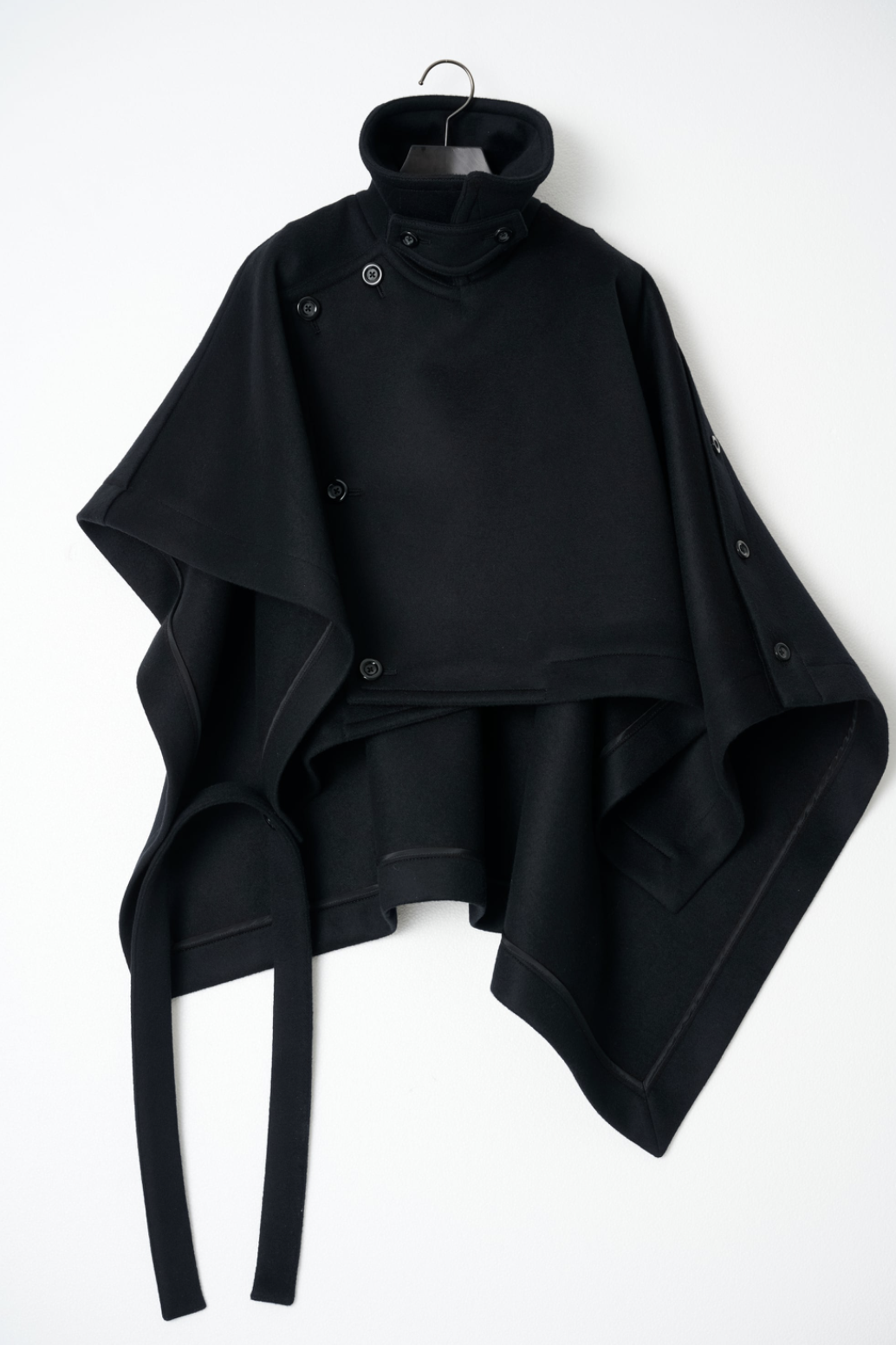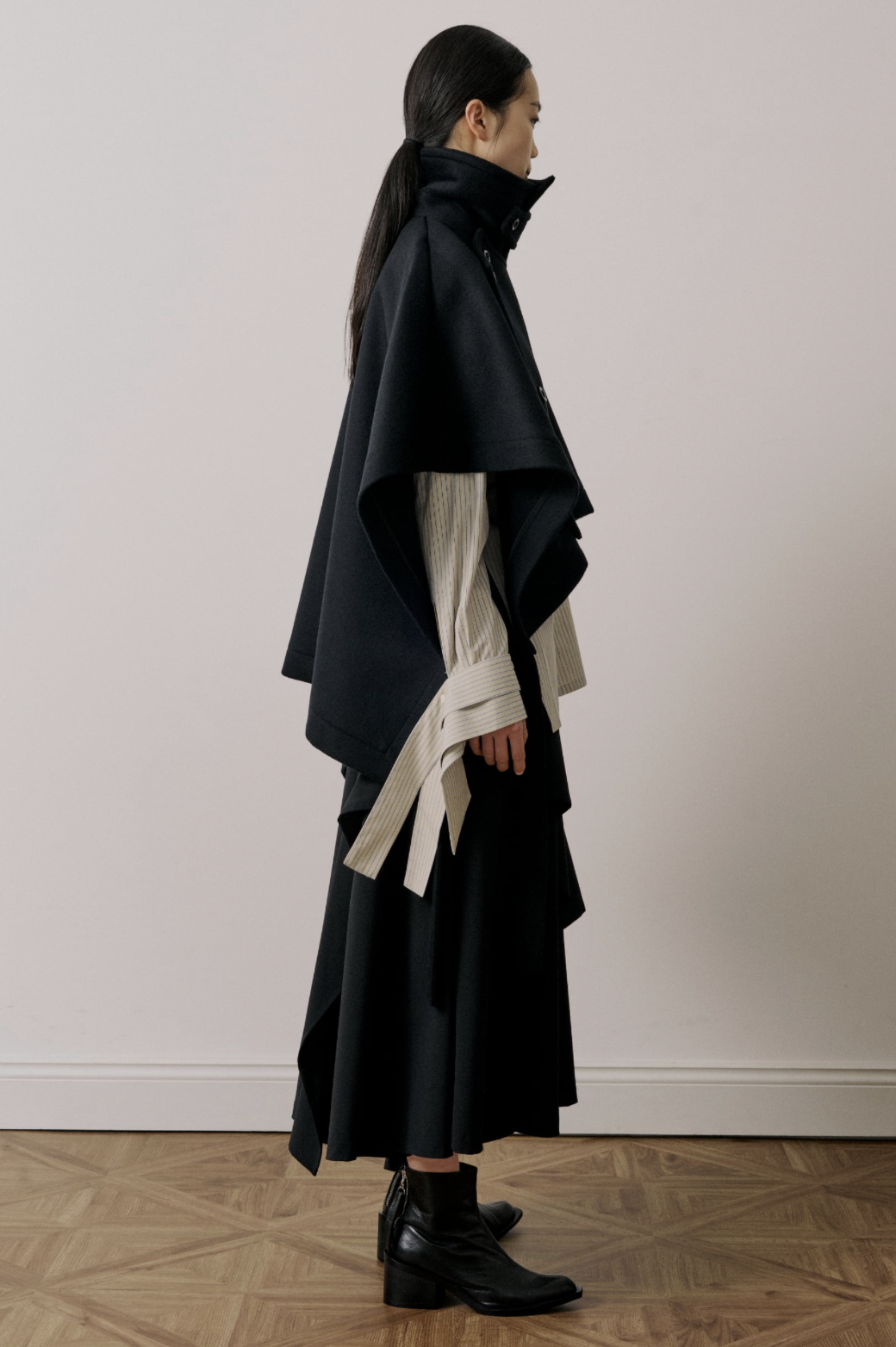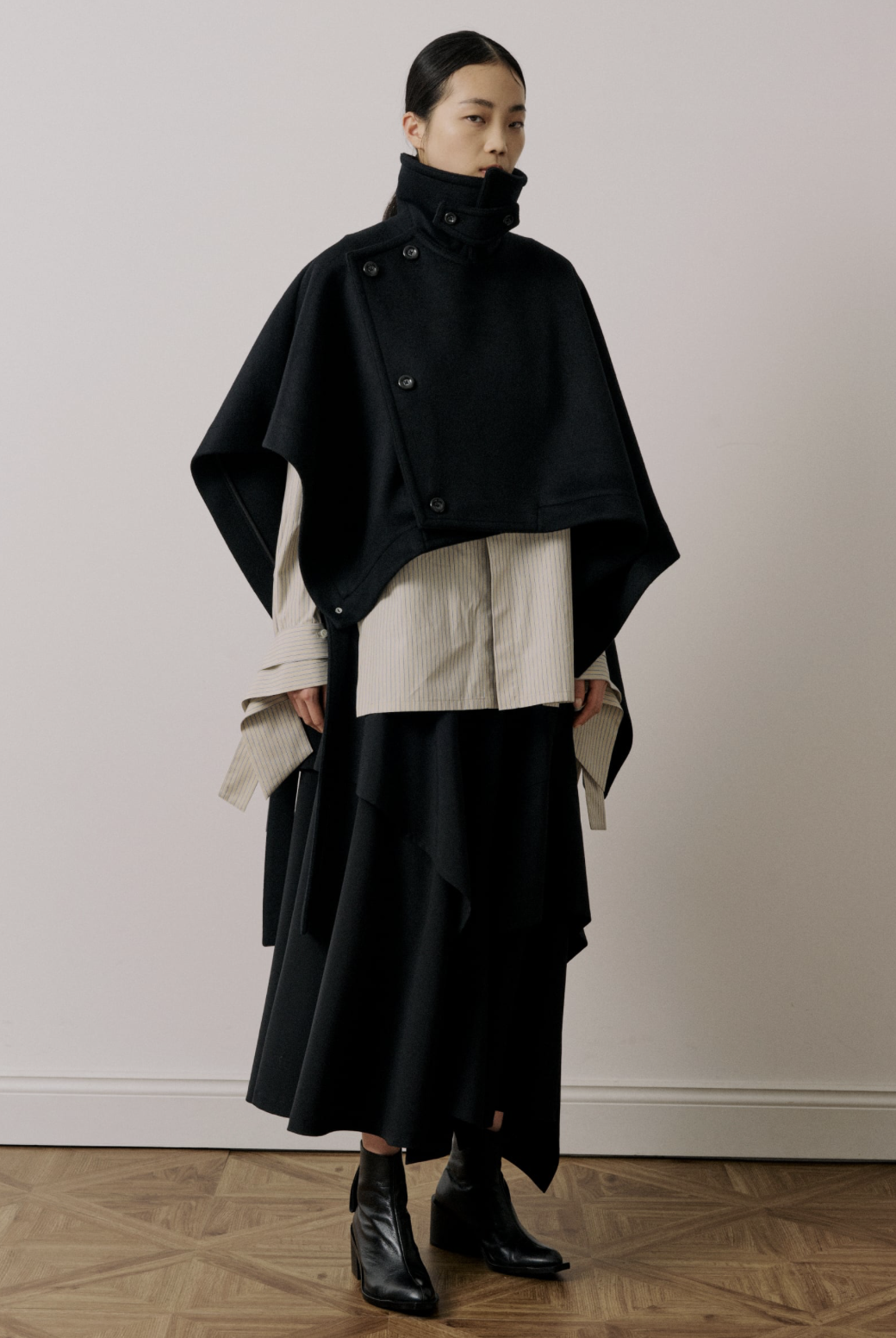 アシンメトリーで動きのあるデザインのケープです。裾や前端、肩の直線的なカッティングがスタイリッシュな雰囲気に仕上がっています。左肩は釦で開閉可能なので、釦を外し崩したスタイリングも可能です。