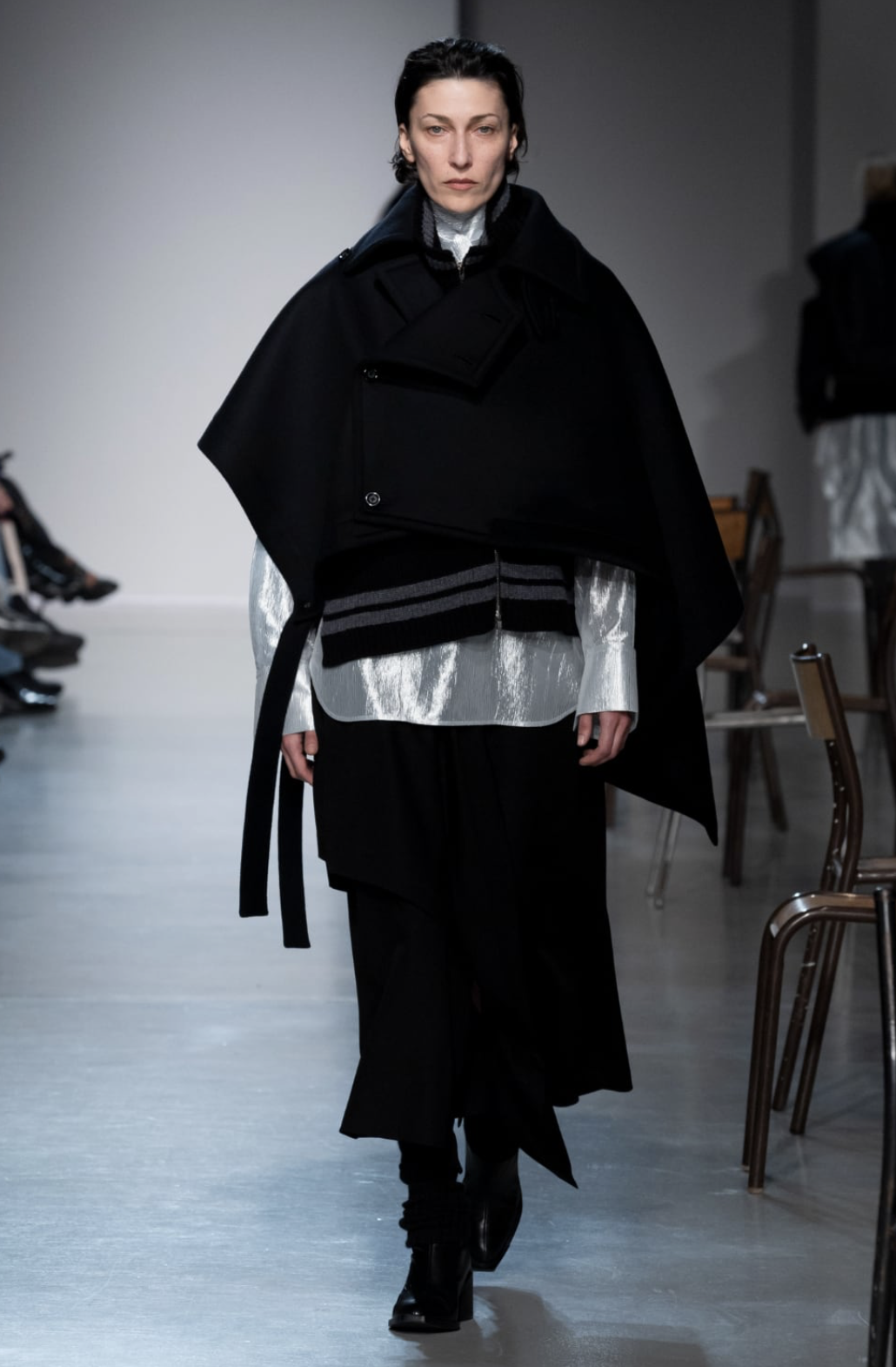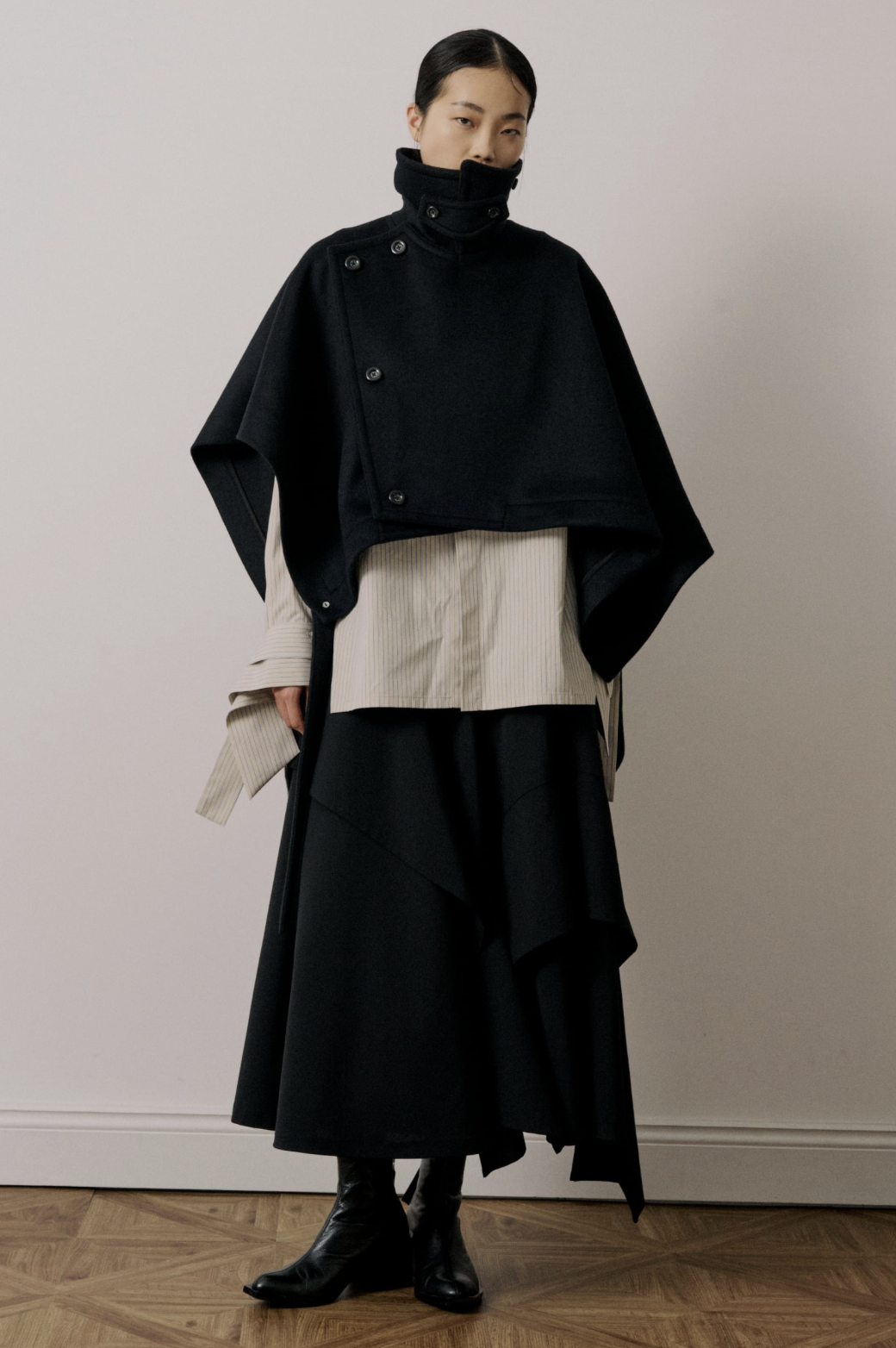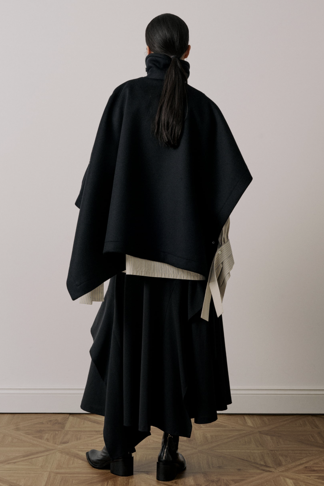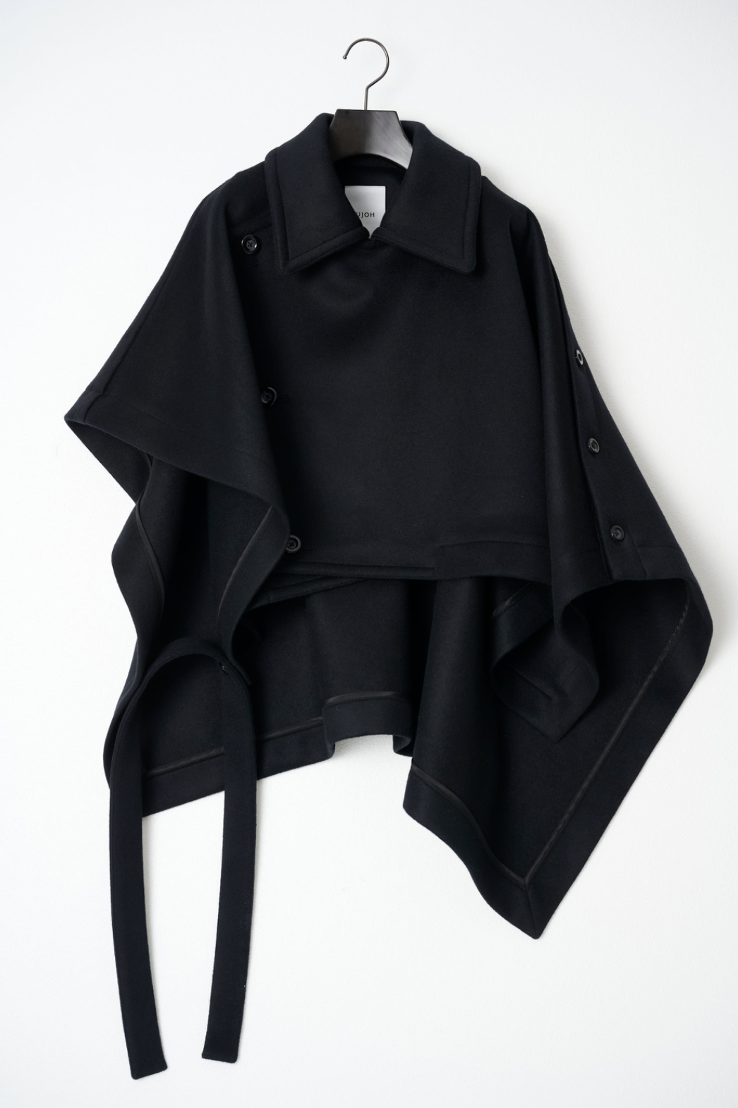 アシンメトリーで動きのあるデザインのケープです。裾や前端、肩の直線的なカッティングがスタイリッシュな雰囲気に仕上がっています。左肩は釦で開閉可能なので、釦を外し崩したスタイリングも可能です。