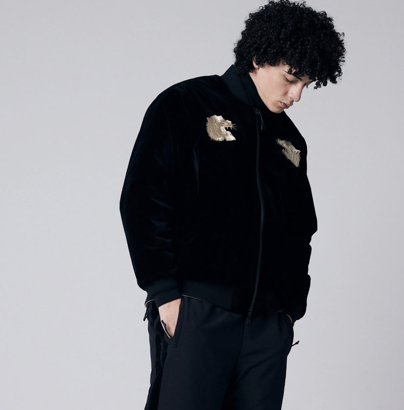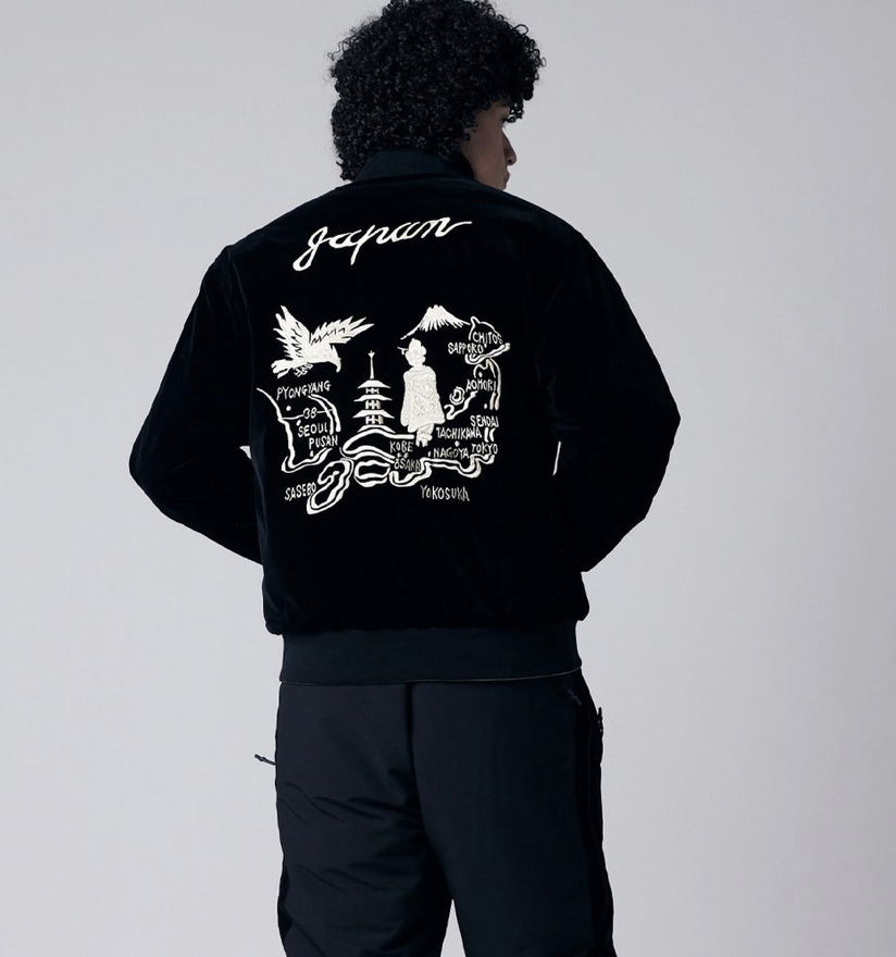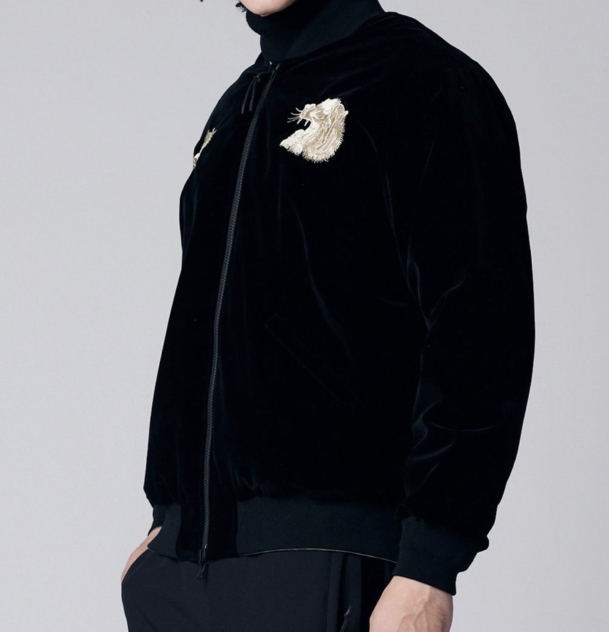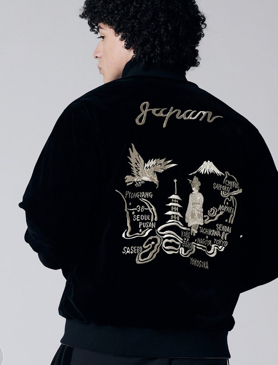 表面には高級感あふれるベロア生地を採用し、背面と前面に施されたスカジャン風の刺繍がアクセントに。ベロアならではの光沢感が、スタイルに華やかさをプラスします。