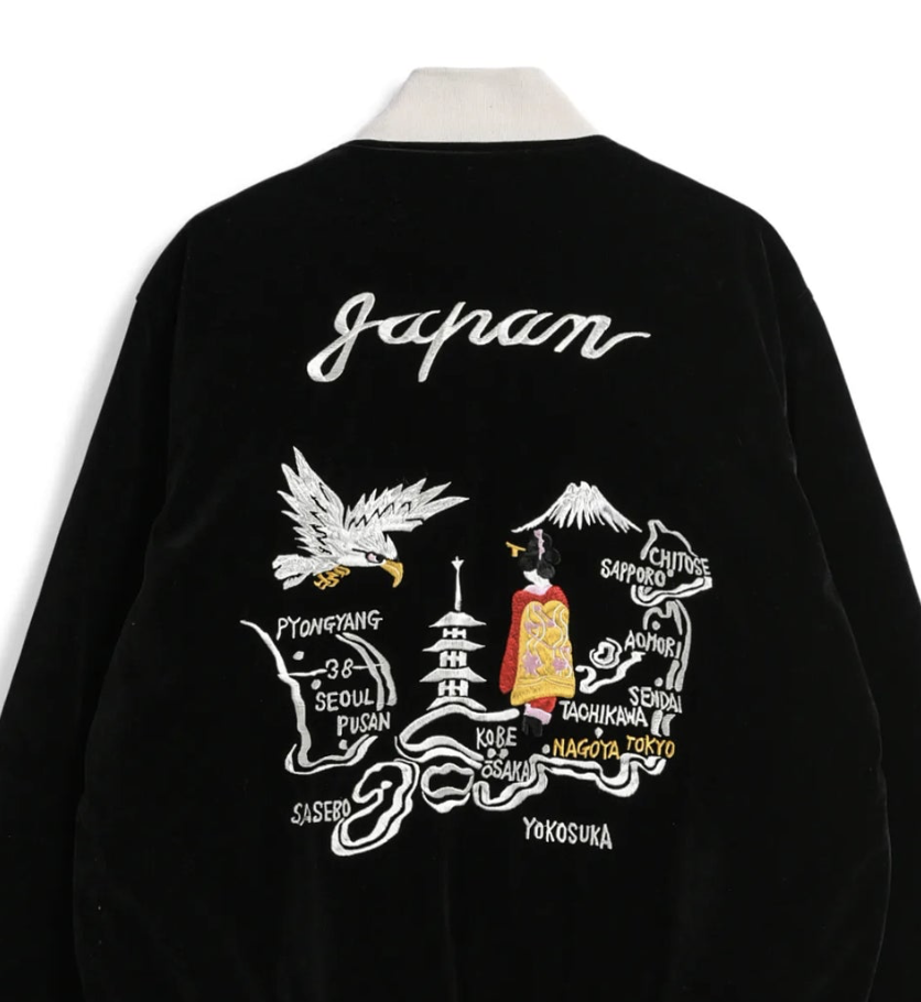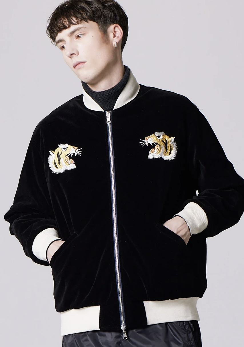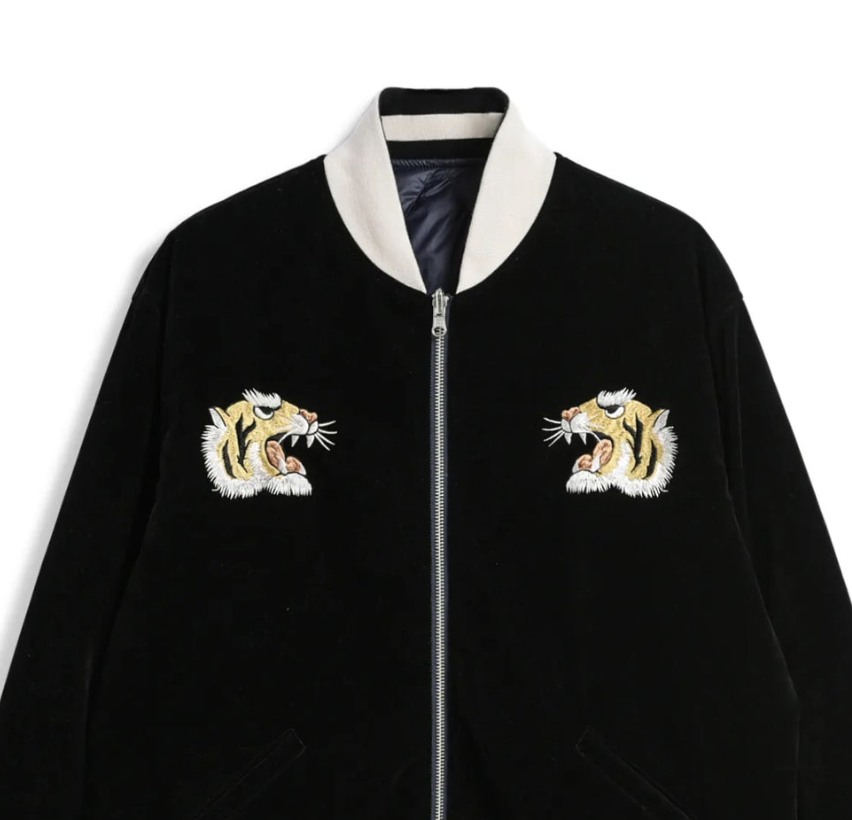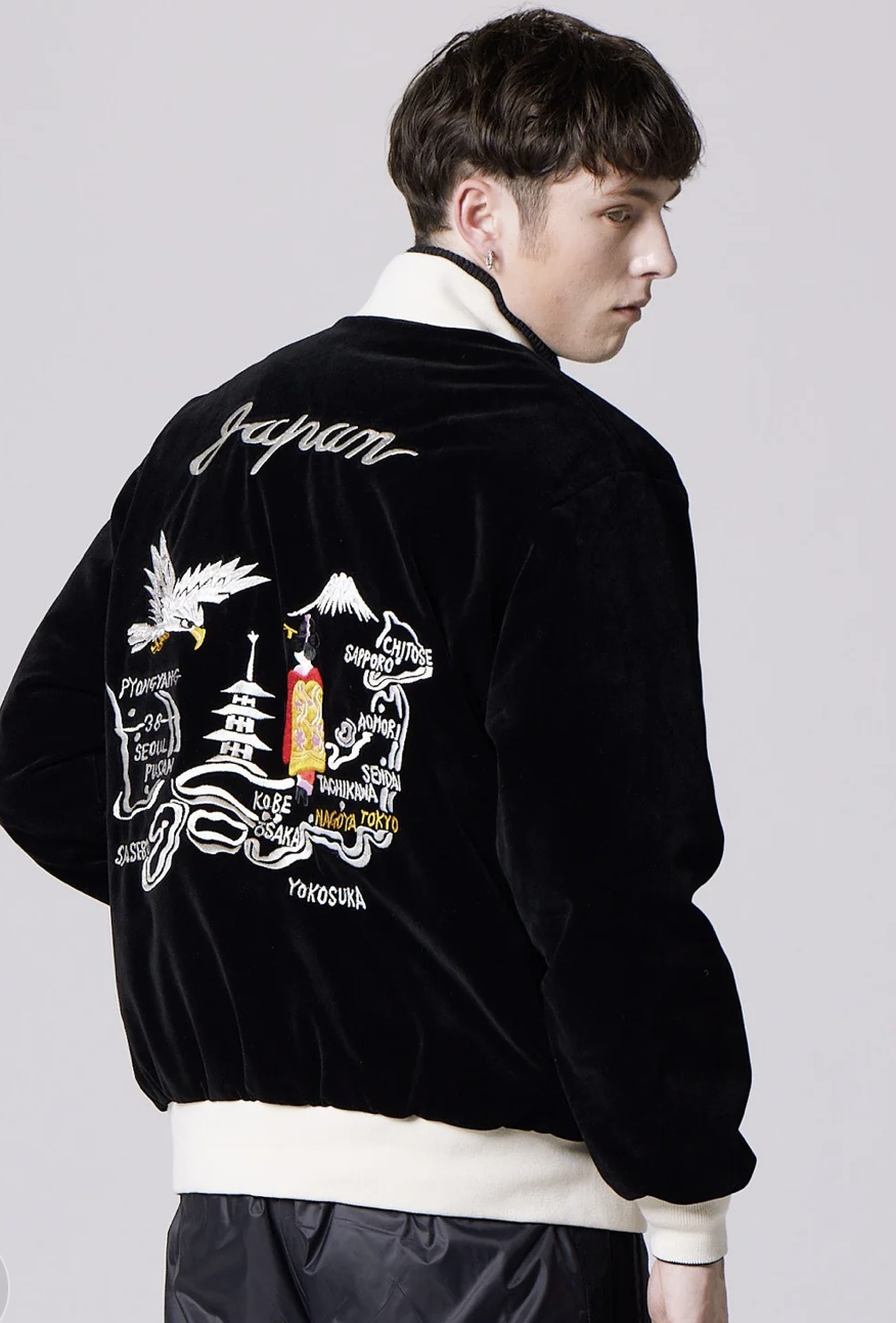 表面には高級感あふれるベロア生地を採用し、背面と前面に施されたスカジャン風の刺繍がアクセントに。ベロアならではの光沢感が、スタイルに華やかさをプラスします。