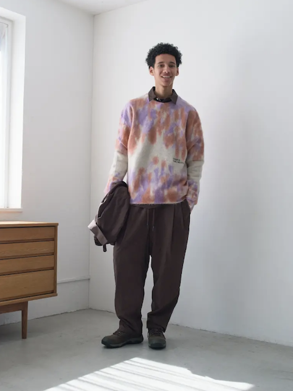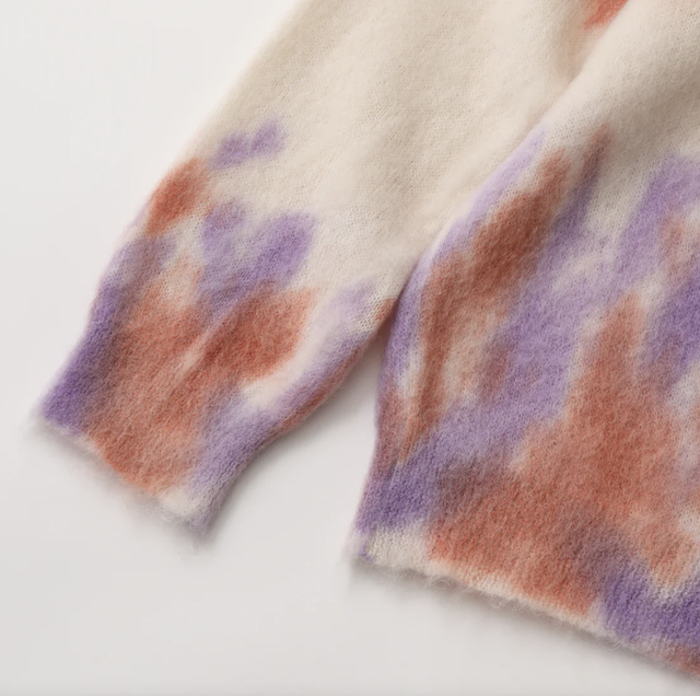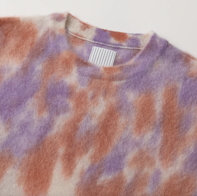 S.F.C (エスエフシー)のDYED MOHAIR CREW / Natural/Orange/Purpleになります。オーバーサイズのモヘアクルーニット。タイダイ染めのような柄は、1点、1点手作業で職人がスプレー染を施したムラ染で表現しています。素材は絹のような上質な光沢とハリ、コシのある滑らかな風合いが特徴のモヘアを使用。近年高騰するモヘア糸を贅沢に7ゲージで度目をしっかりと詰めて編立し、起毛することでよりソフトに仕上げています。