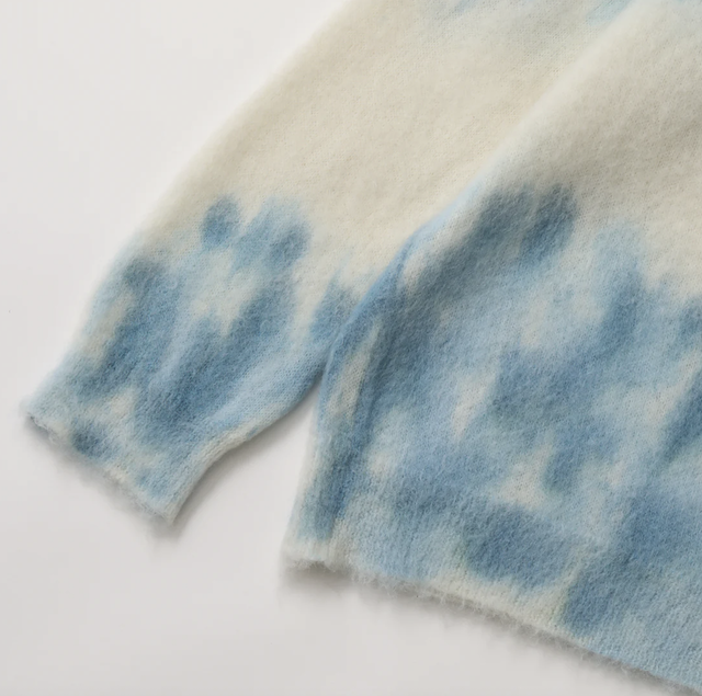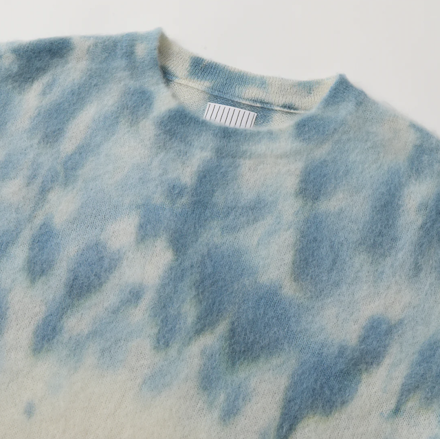 S.F.C (エスエフシー)のDYED MOHAIR CREW / Natural/Blue/Mintになります。オーバーサイズのモヘアクルーニット。タイダイ染めのような柄は、1点、1点手作業で職人がスプレー染を施したムラ染で表現しています。素材は絹のような上質な光沢とハリ、コシのある滑らかな風合いが特徴のモヘアを使用。近年高騰するモヘア糸を贅沢に7ゲージで度目をしっかりと詰めて編立し、起毛することでよりソフトに仕上げています。