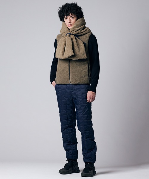 表側には、ナイロンリップストップ素材に保温性の高い800FPダウンを使用、裏側には、厚みのあるボア素材を組み合わせました。