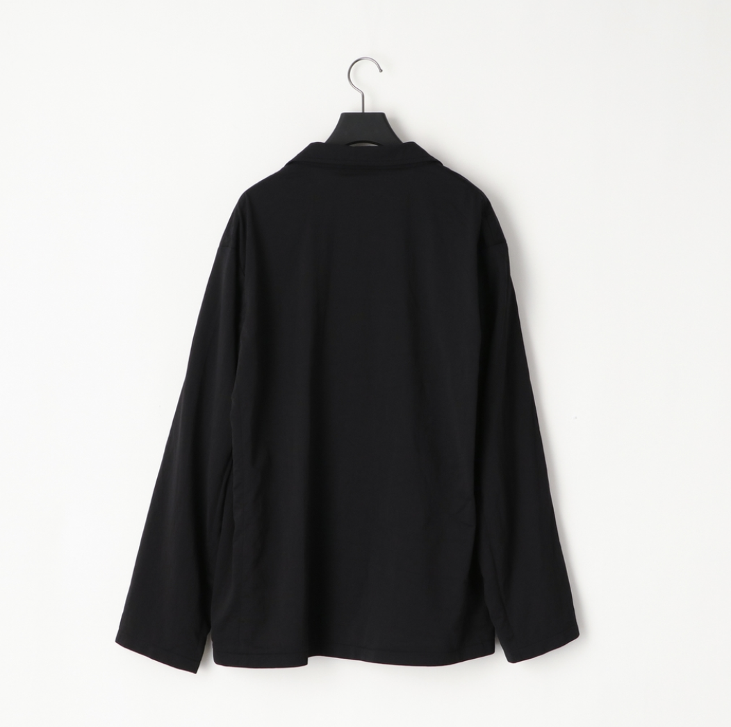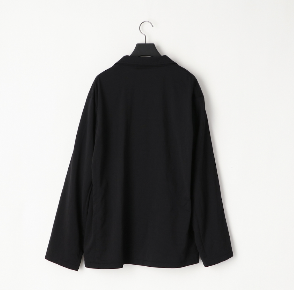36Gという、スーパーハイゲージで、表面感のある梨地を作成。ストレッチ性が高く一度着ると止められない着心地、そして、着用時のしわなどの形態変化も少なく、イージーケア性も高い。 ハリ感、光沢感、イージーケアを持ち併せた我々にしかできないニュースタンダード素材。 ディティールは、ドレスシャツを採用し全て巻き伏せ本縫い仕様、貝蝶釦使いです。素材のハリ感、光沢感、そして塩梅の良いシルエット、生地が生み出すドレッシー感とパターンを融合させた、唯一無二のシャツ。新素材のナイロンは、50D 高捲縮ナイロン糸を100%使い。表面感のある素材をすべて特殊洗いをかけることで、よりハリ感を出して作成しました。タンブラー乾燥を製品状態でかけることで、洗濯後の縮みがございません。